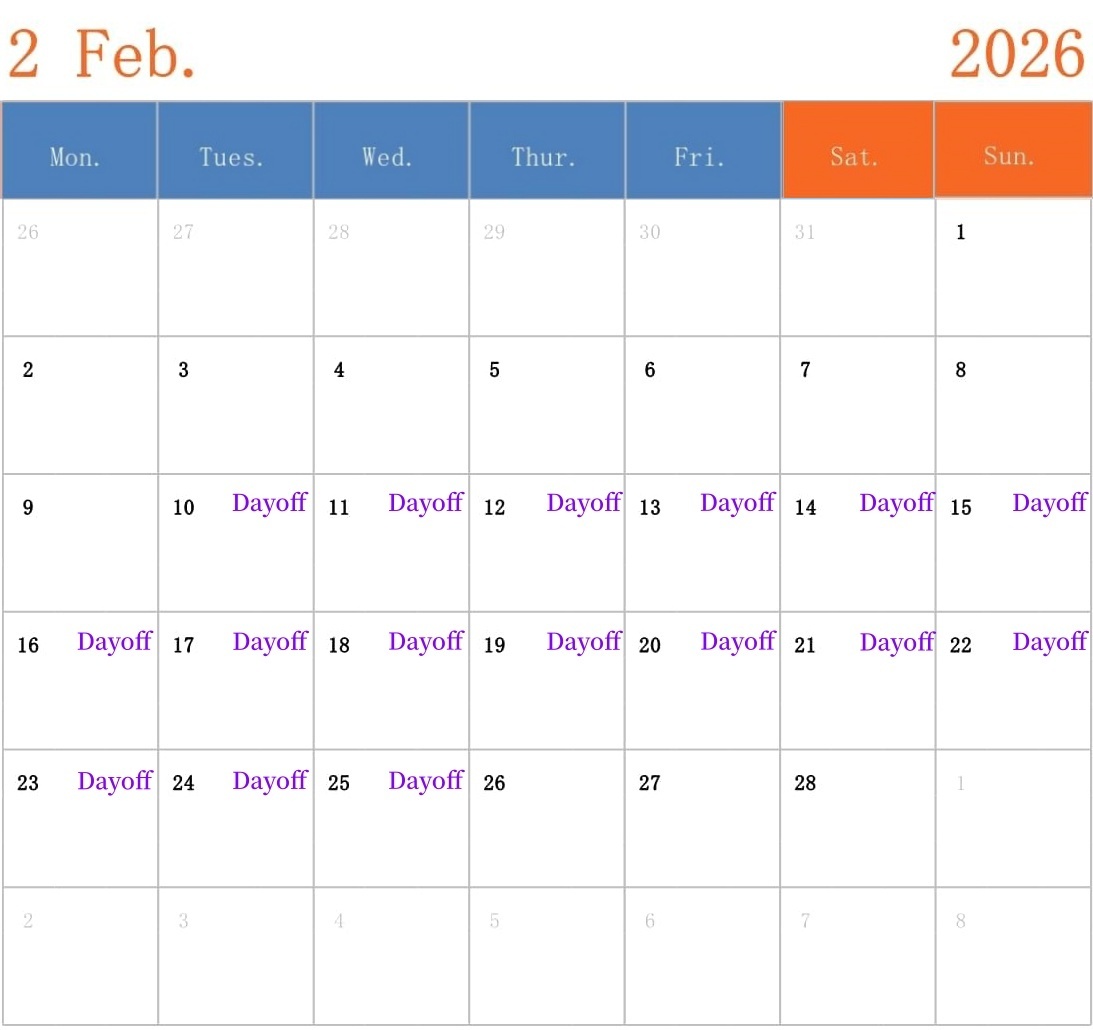 Chinese Lunar New Year will be coming around the corner, we will have lunar new year- Spring Festival holiday in next month-February 2026. The specific date is scheduled as follows, for any urgent matters during this period please contact our sales manager at phone/whatsApp:+86-15168183169.